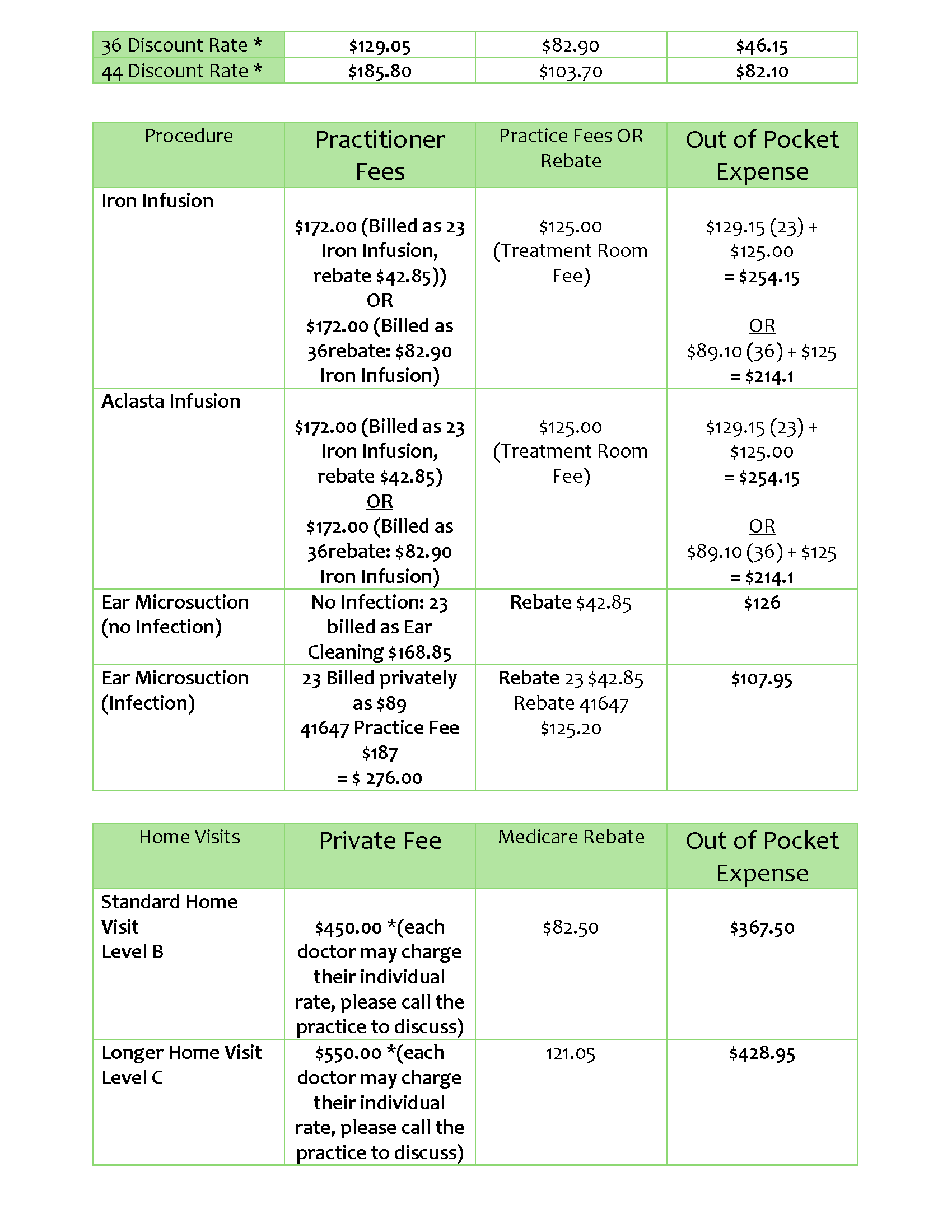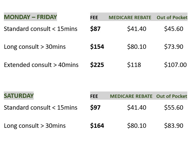 Disclaimer: The above fees are current as of 14/01/ 2025. All fees are at the discretion of individual Doctors. Please be aware they may use their own Schedule of Fees that differ to the listed Standard Practice Fees. All Tyro Payments are subject to merchant fee charges.