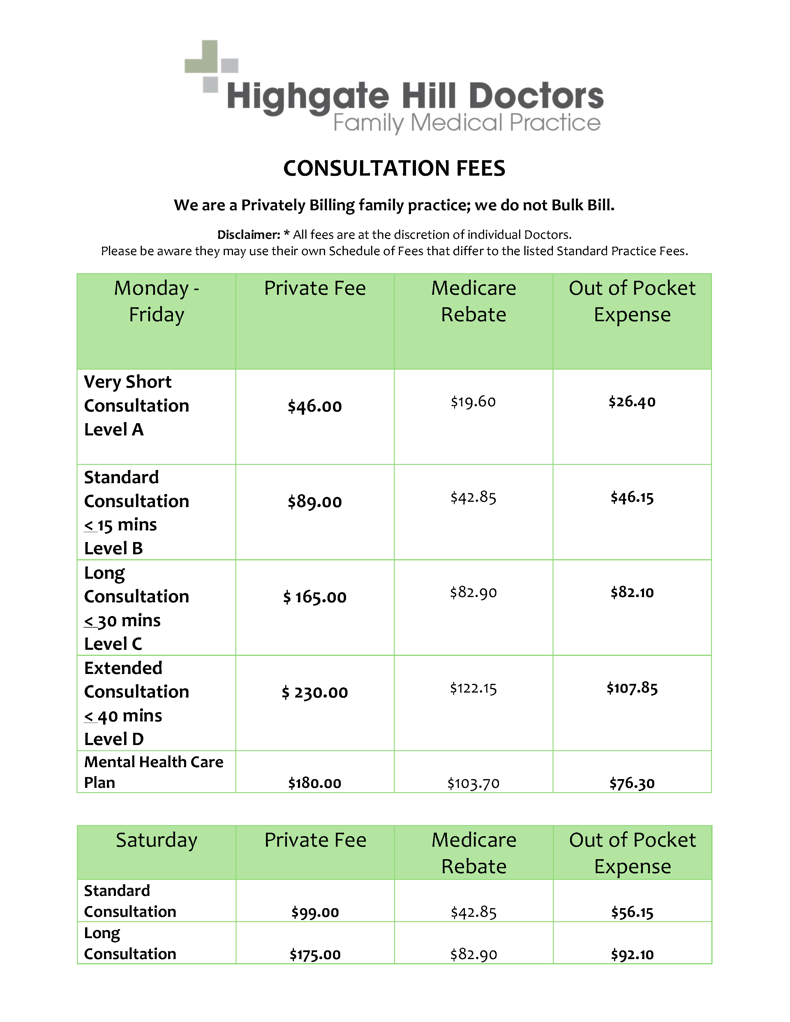 Saturday and after hours consultations incur a higher fee.